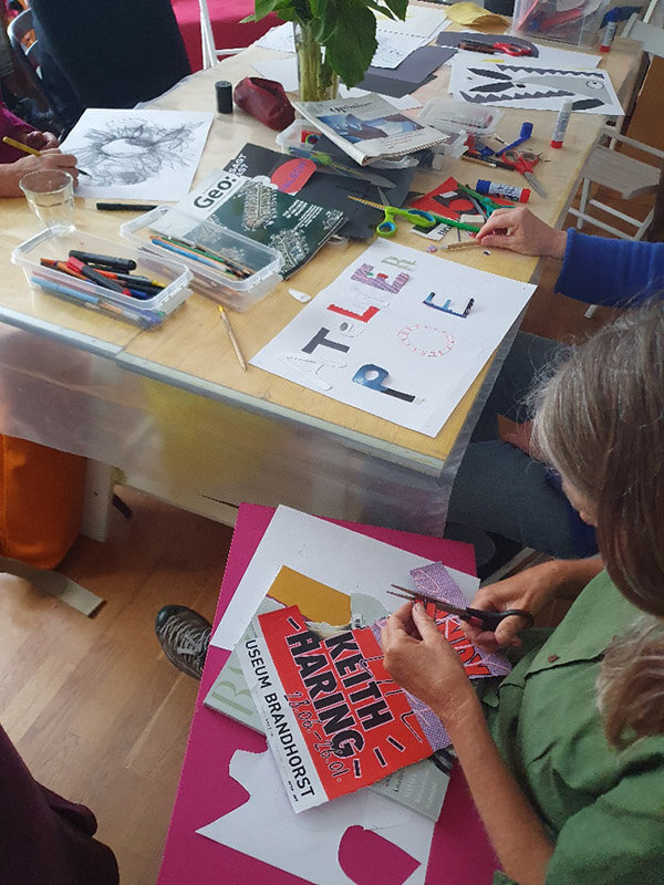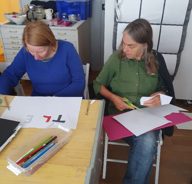 Keep an eye out for the results of the workshop next time you visit Atelierprojekt! Silke and Sabine designed a new sign for the front door, Karin and Barbara combined their styles for some collaborative posters, and Jess dove deep into mark-making and layering experiments. Somewhere along the way, the idea came up to create custom wallpaper to decorate the Atelierprojekt toilet—so stay tuned!