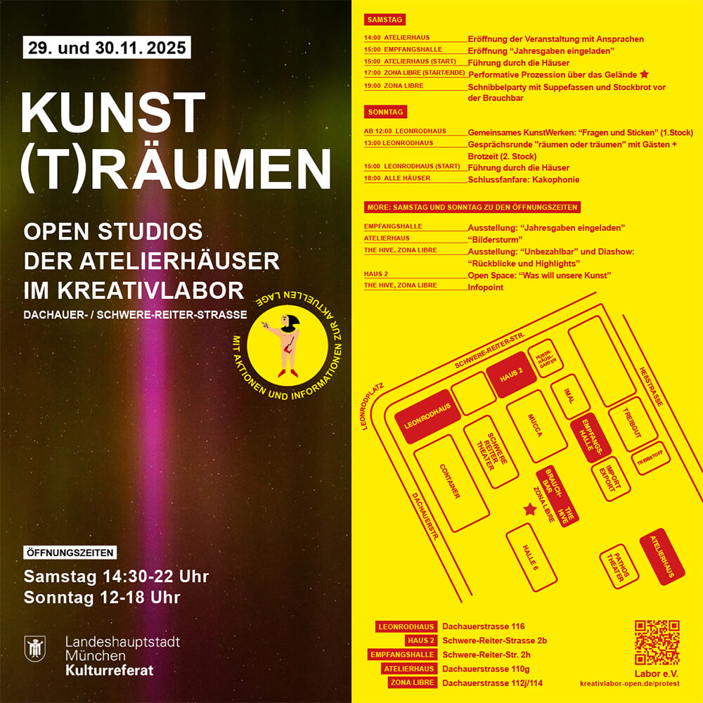 Am 29. und 30.11.2025 gestalten die Studios im Kreativquartier (Atelierhaus, Haus 2, Leonrodhaus, Empfangshalle) ein ganzes Wochenende rund um unsere Bemühungen bezahlbare Arbeitsräume für Künstler*innen und Kreativschaffende in München zu schaffen und im Besonderen im Kreativquartier zu erhalten.