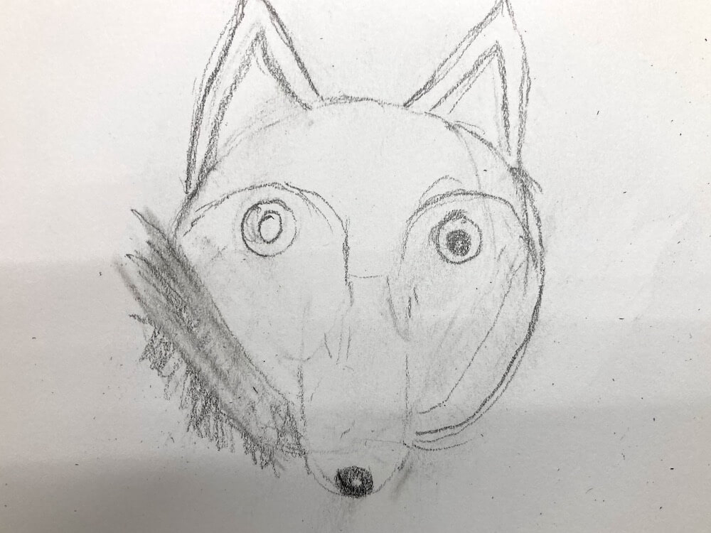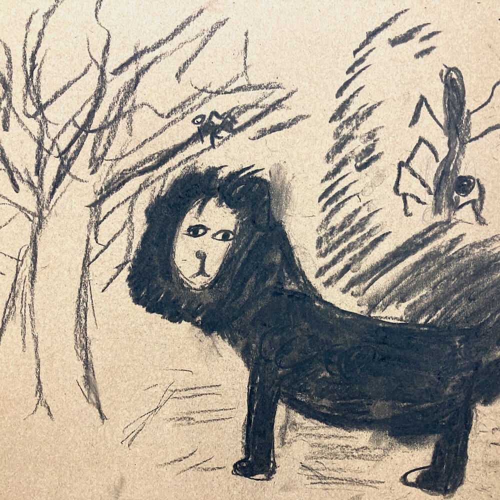 Zeichnung aus der Malwerkstatt für Kinder „Die Kuscheltiere sitzen Modell“, 2025